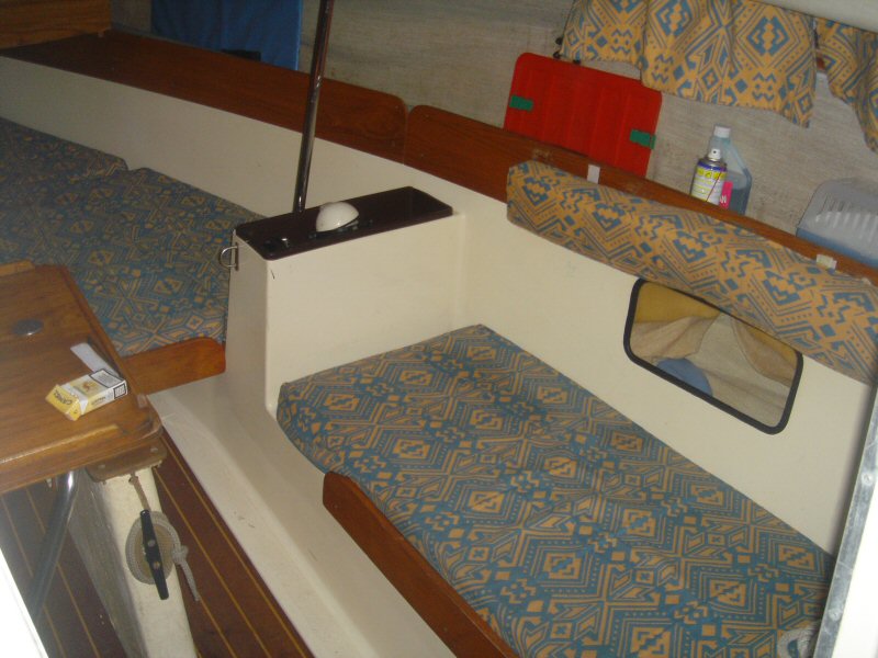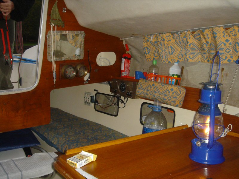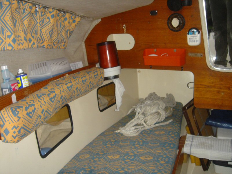 Les couchettes babord et tribord arrière, on voit les équipements de navigation et les rangements large emplacement sous le cockpit pour y loger les choses volumineuses, j'y loge un WC chimique, béquilles de bateau etc...