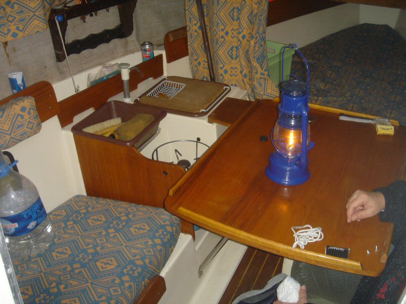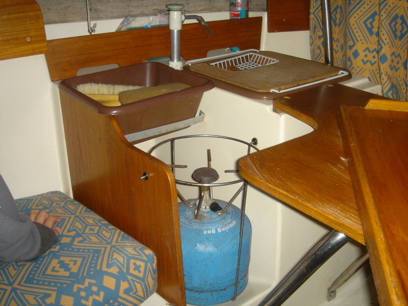 Une cuvette et son support et sous la planchette avec le porte savon, l'évier amovible sous lequel se trouve la réserve d'eau douce alimentant la pompe à eau. Réchaud gaz sur support cardan.
