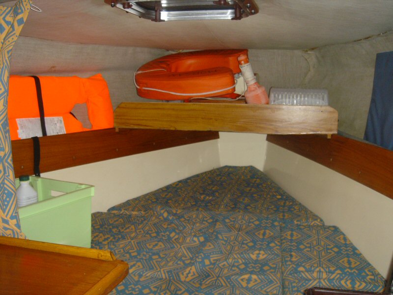 Le poste avant avec sa couchette deux places des équipets de rangements, une étagère supplémentaire amovible. A droite la banquette tribord avec ses équipets.